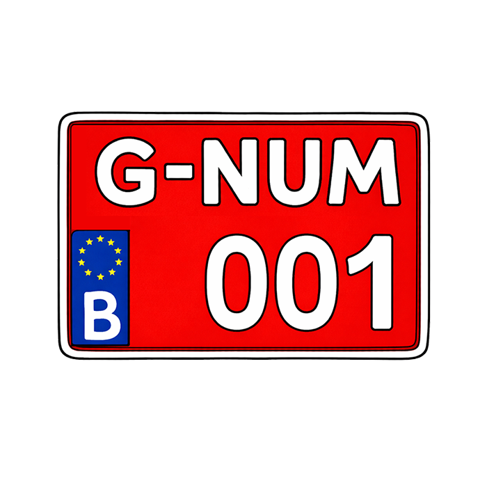 De Federale Overheidsdienst Mobiliteit en Vervoer heeft onze rode G-nummerplaten goedgekeurd. De letters, die linksboven op onze rode G-nummerplaten staan, verwijzen naar het certificaat, dat onze platen gekregen hebben.